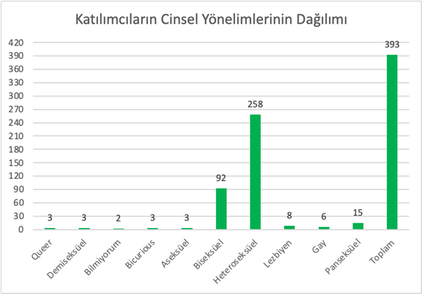 Anketi yanıtlayan kişilerden 104’ü kendini biseksüel, 258’i heteroseksüel, 8’i lezbiyen, 6’sı gey, 15’i panseksüel, 3’ü kuir, 3’ü demiseksüel, 3’ü aseksüel, 3’ü bi-curious olarak tanımlarken 2 kişi ise bilmediğini ifade etmiştir.