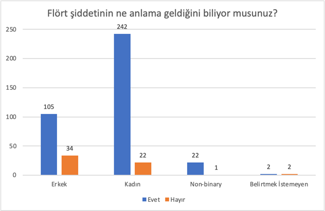 “Flört şiddetinin ne anlama geldiğini biliyor musunuz?” sorusuna ankete katılan kadın katılımcılardan %91’i, non-binary katılımcılardan %95’i “evet” cevabını verirken bu oran erkek katılımcılarda %75 oranındadır. Dolayısıyla ankete katılan örnekleme göre kadınların ve non-binary’lerin flört şiddeti kavramına erkeklere kıyasla daha hâkim olduğu çıkarımı yapılabilir. Aynı soruya evet cevabı veren katılımcıların yaşlara ve sınıflara göre dağılımına bakıldığında aralarında önemli bir fark olmadığı görülmüştür.