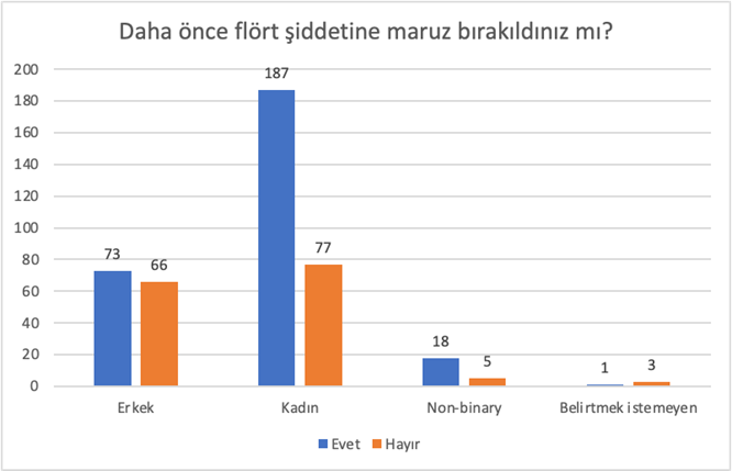 “Daha önce flört şiddetine maruz bırakıldınız mı?” şeklindeki sorunun “evet” ya da “hayır” şeklinde değerlendirilmesi istenmiştir. 433 öğrencinin 281’i soruya “evet” yanıtını vermiştir. Ankete katılan 264 kadın öğrencinin 187’si, 140 erkek öğrencinin 74’ü, non-binary 23 kişi- nin 18’i ve cinsiyetini belirtmek istemeyen 3 kişinin 1’i daha önce flört şiddetine maruz bırakıldıklarını ifade etmişlerdir. Çeşitli alanlarda süregelen toplumsal cinsiyet eşitsizliği, şiddeti pekiştiren kültürel normlar, ekonomik ve politik eşitsizlikler ve yasaların uygulanmasındaki yetersizlikler flört şiddetine kadın ve non-binary öğrencilerin daha çok maruz kalmasının arkasındaki çeşitli toplumsal sebeplerden olabilir. Aynı zamanda toplumsal cinsiyet eşitsizliği ve konu hakkındaki farkındalıklarının az olması erkeklerin de yüksek oranda flört şiddetine maruz kalmalarına neden olarak gösterilebilir.