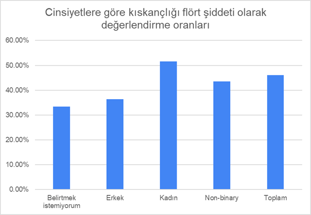 Katılımcıların %53,8’i kıskançlığı flört şiddeti olarak ele almadığını belirtti. Kadına yönelik şiddetin ve kadın cinayetlerinin de bahanesi, hatta bazen faillerin iyi hâl indirimi almasına sebep olan kıskançlık, sanıldığı kadar masum mu? Kıskançlığı sevinç ya da üzüntü gibi doğal ve insani bir duygu olarak nitelendirebiliriz. Kıskançlığın ne boyutta olduğu, eyleme dökülüp dökülmediği ya da bu duyguyla nasıl başa çıkıldığı önem taşıyor çünkü bu soruların cevaplarına göre kıskançlığı kontrolcü davranıştan ayırabiliriz. Kıskançlık, kontrolcü davranışa dönüşmeye başladığında kişiler kendilerini toksik bir ilişkinin içinde buluyorlar.[4] Toksik ilişkiyi uzun süre fark edilmeyen duygusal ve fiziksel zarar veren, yıkıcı etkisi olan, kişinin kendini iyi hissetmediği fakat bunlara rağmen asla vazgeçemediği bir nevi kişiyi zehirleyen ilişki olarak tanımlayabiliriz.[5] Aynı zamanda kıskançlık hem psikolojik hem fiziksel şiddete evrilme olasılığı olan bir duygu olduğundan kolayca flört şiddeti olup olmadığına karar verilemeyen bir kavram. İnsanların büyük çoğunluğu kıskançlık duygusunu hayatlarının belli dönemlerinde gerek partnerlerine gerek arkadaşlarına veya aile üyelerine karşı hissediyorlar. Fakat bu hissin yaygın olması bu histen doğan sonuçların bahanesi olamayacağından bireyler gösterebilecekleri veya maruz kaldıkları kıskançlığın farkında olmalı. Kıskançlığın dozunun aşıldığı -yani bir tarafa psikolojik veya fiziksel bir şekilde zarar verildiği- fark edildiğinde bunun bir çeşit flört şiddeti olduğunun bilinmesi ve önleminin alınması gerekir.