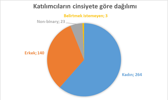 Araştırmada toplamda 433 katılımcı bulunmaktadır. Katılımcılardan 140 kişi erkek, 264 kişi kadın, 23 kişi non-binary olarak kendini tanımlarken 3 kişiyse cinsiyetini belirtmek istememiştir. Gelen cevaplardan 3’ü ise geçersizdir.
