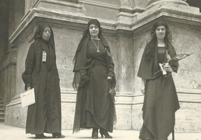 Nebeviye Musa, Huda Shaarawi ve Saiza Nabarawi, Roma Kongresi dönüşünde tren istasyonunda, 1923.[7]